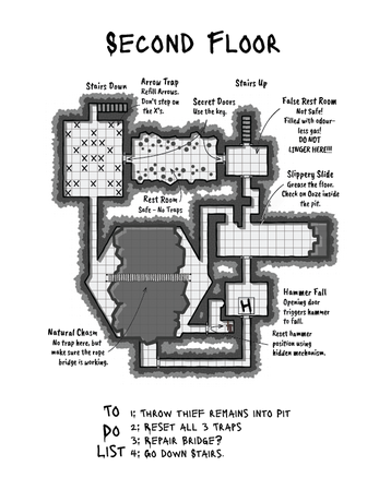 The Thief Trap is a dungeon designed to kill thieves, highwaymen, and bandits. It is a well known location, which the local town deceives others to think that it holds all of their treasure. However, the adventurer’s are not thieves. They are contracted to scout out the dungeon, repair and reset the traps, and remove the remains of the thieves who died here.